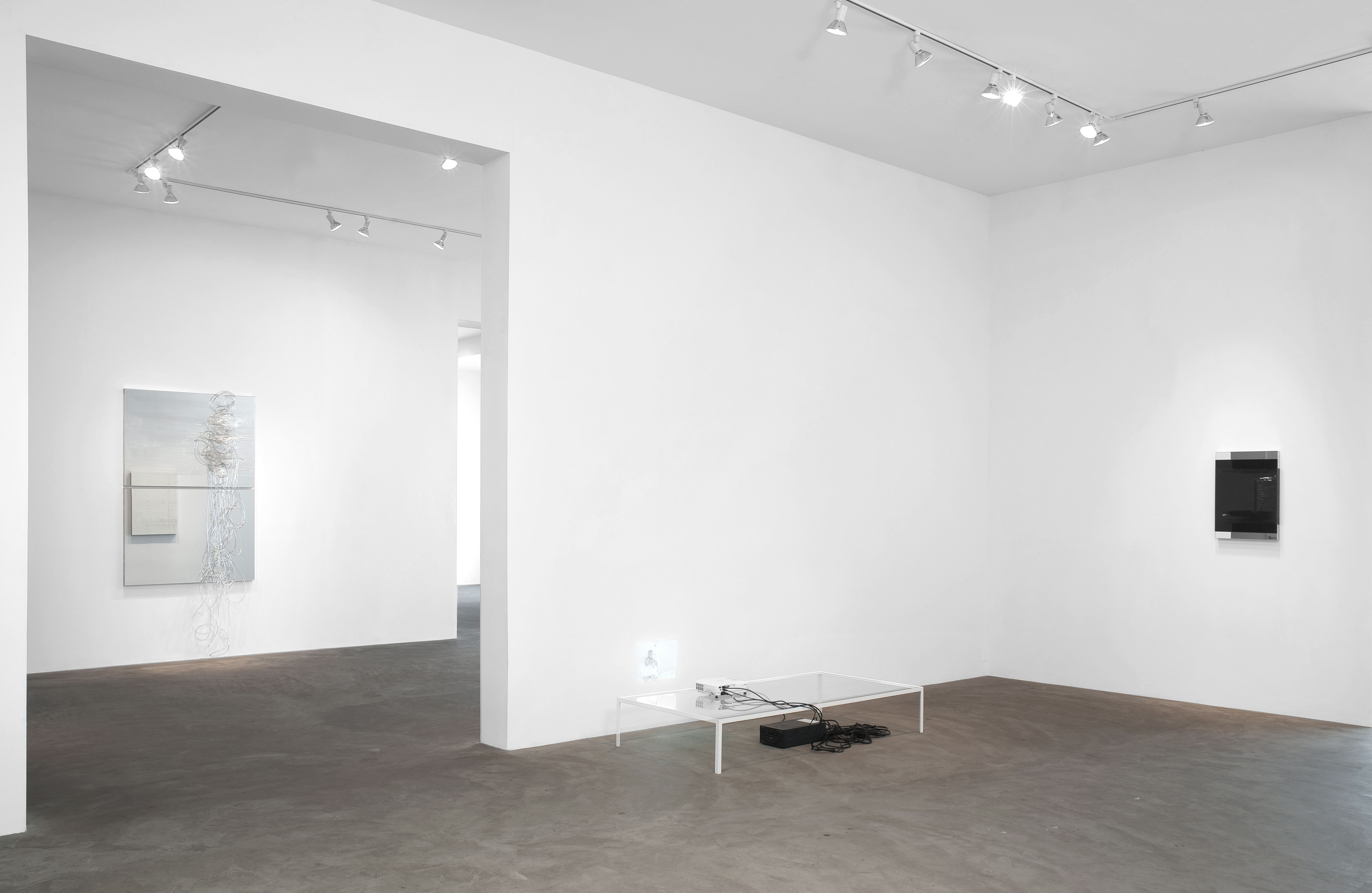 (left to right) Kracklite 2010, powder-coated steel, glass, projector and dvd player, 16 x 72 x 37 inches; Untitled (Black) 2010, 24 x 18 x 5 inches and Untitled (Black) 2010, 48 x 36 x 2 inches, both aluminum, mirror, plexiglas, stretch wrap and enamel